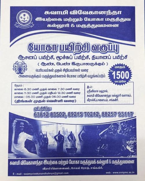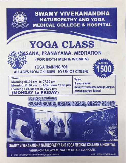 A Mega Naturopathy Medical Camp is scheduled to be conducted by Swamy Vivekanandha Naturopathy and Yoga Medical College for 5 Days in Our SVNYMC Hospital, Sankagiri, Salem