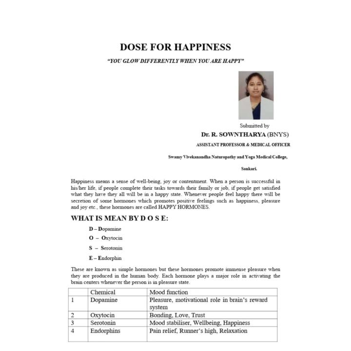Article about Dose for Happiness by Dr. R. Soundharya Assistant Professor cum Medical Officer, Swamy Vivekanandha Naturopathy and Yoga Medical College, Sankari, salem(dt)