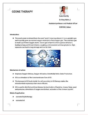 Article about a Treatment Modality called 'Ozone Therapy' by Dr.MaryNisha.J Assistant Proffesor cum Medical Officer, SVNYMC,Sankagiri, Salem.