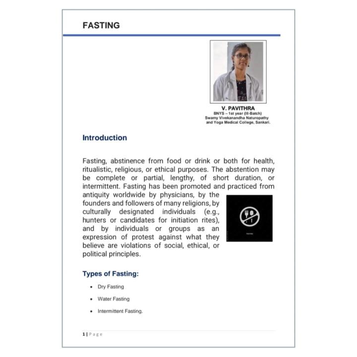 Take a look at this Article about FASTING by our student V.Pavithra I - BNYS Part- I , Swamy Vivekanandha Naturopathy and Yoga Medical College, Sankari , Salem(dt)