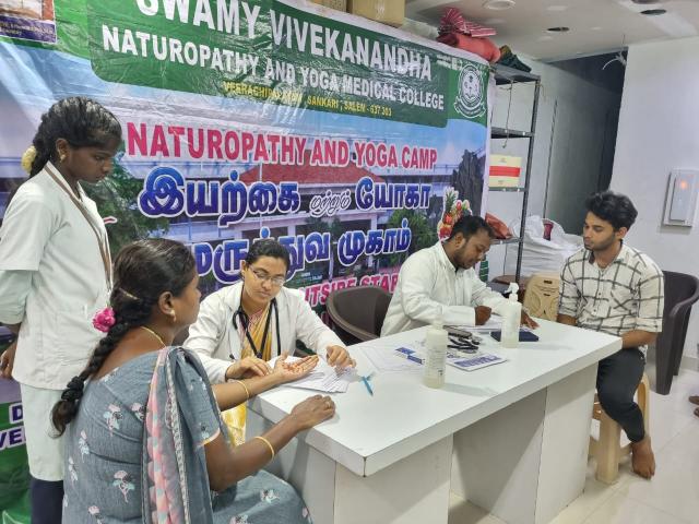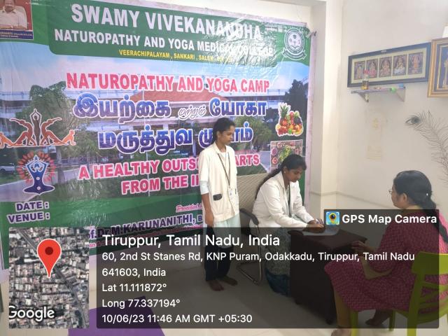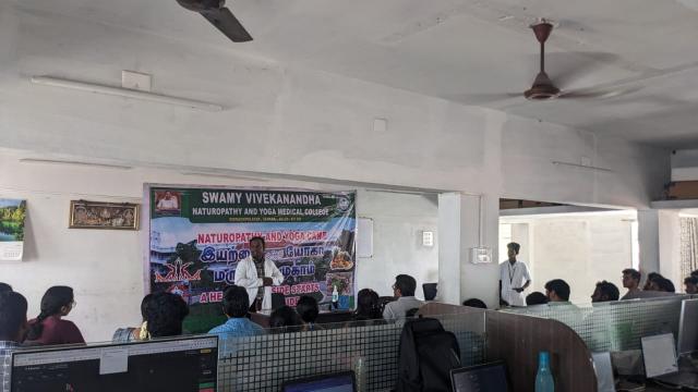 Swamy Vivekanandha Naturopathy and Yoga Medical College and Hospital, sangakiri, salem conducted Naturopathy and Yoga Medical camp at AXN Infotech Tally, Tirupur on 10.6.2023. Around 50 beneficiaries were consulted and treated.