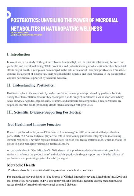 Article about"Unlocking The Power Of Postbiotics:The Next Frontier in Gut Health" by Dr.Anoop Kumar Assistant professor cum Medical Officer, Swami Vivekananda Naturopathy and Yoga Medical college,Sankari,Salem(dt).
