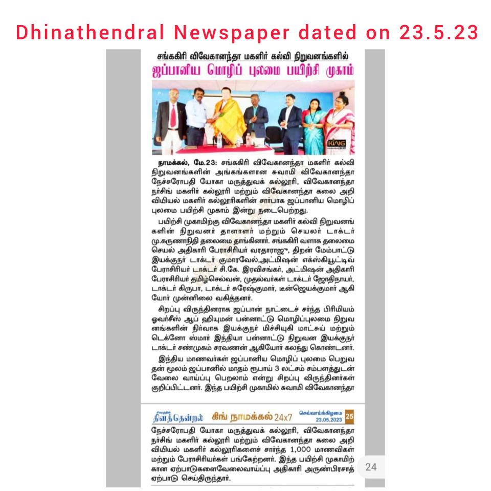 Vivekanandha Educational Institution, Sangakiri, Salem conducted Skill Development program on Learning of Japanese Language on 22.5.2023 at Sangakiri campus. The Resources person were Mr. Mitsi Yuhi Matsui, Managing Director,Premium Overseas, JAPAN and Director Dr. shanmugam Saravanan,Techno Smart India. Around 1000 students enthusiastically participated.