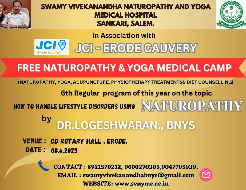 Swamy Vivekanandha Naturopathy and Yoga Medical College and Hospital, sangakiri, salem conducted Naturopathy and Yoga Medical camp at JCI Galexy CD Rotary Hall, Erode on 8.6.2023. Around 50 beneficiaries were consulted and treated.