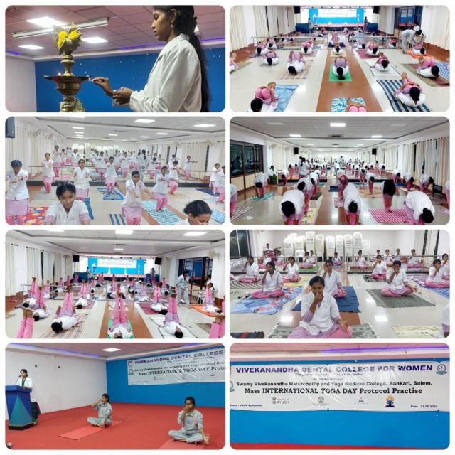Swamy Vivekanandha Naturopathy & Yoga Medical College, Sankagiri, Salem celebrated International Yoga day 2023 by conducting Mass Yoga Protocol practice session for the students and Faculties of Vivekanandha Dental College for Women, Elayampalayam, Tiruchengode.