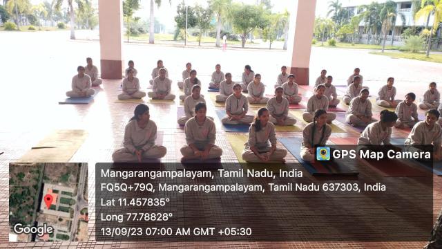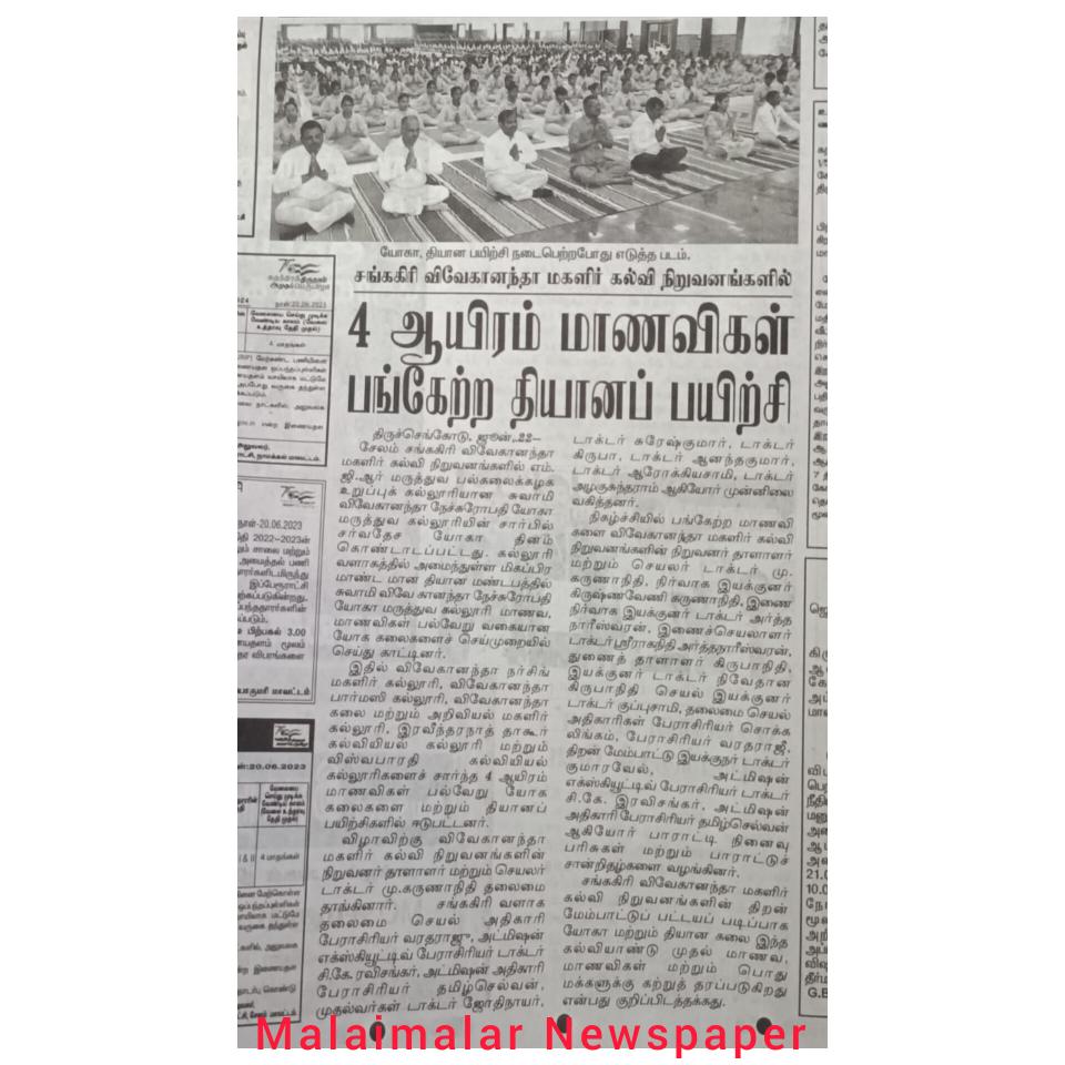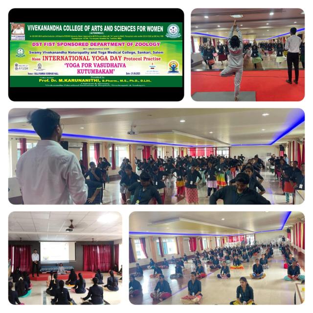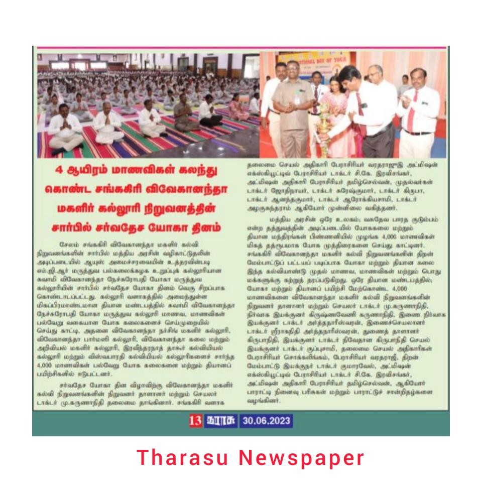 Swamy Vivekanandha Naturopathy & Yoga Medical College, Sankagiri, Salem celebrated International Yoga day 2023 by conducting Mass Yoga Protocol practice session for the students and Faculties of Vivekanandha College of Arts & Science, for Women & vivekanandha college of Technology for Women, Elayampalayam, Tiruchengode