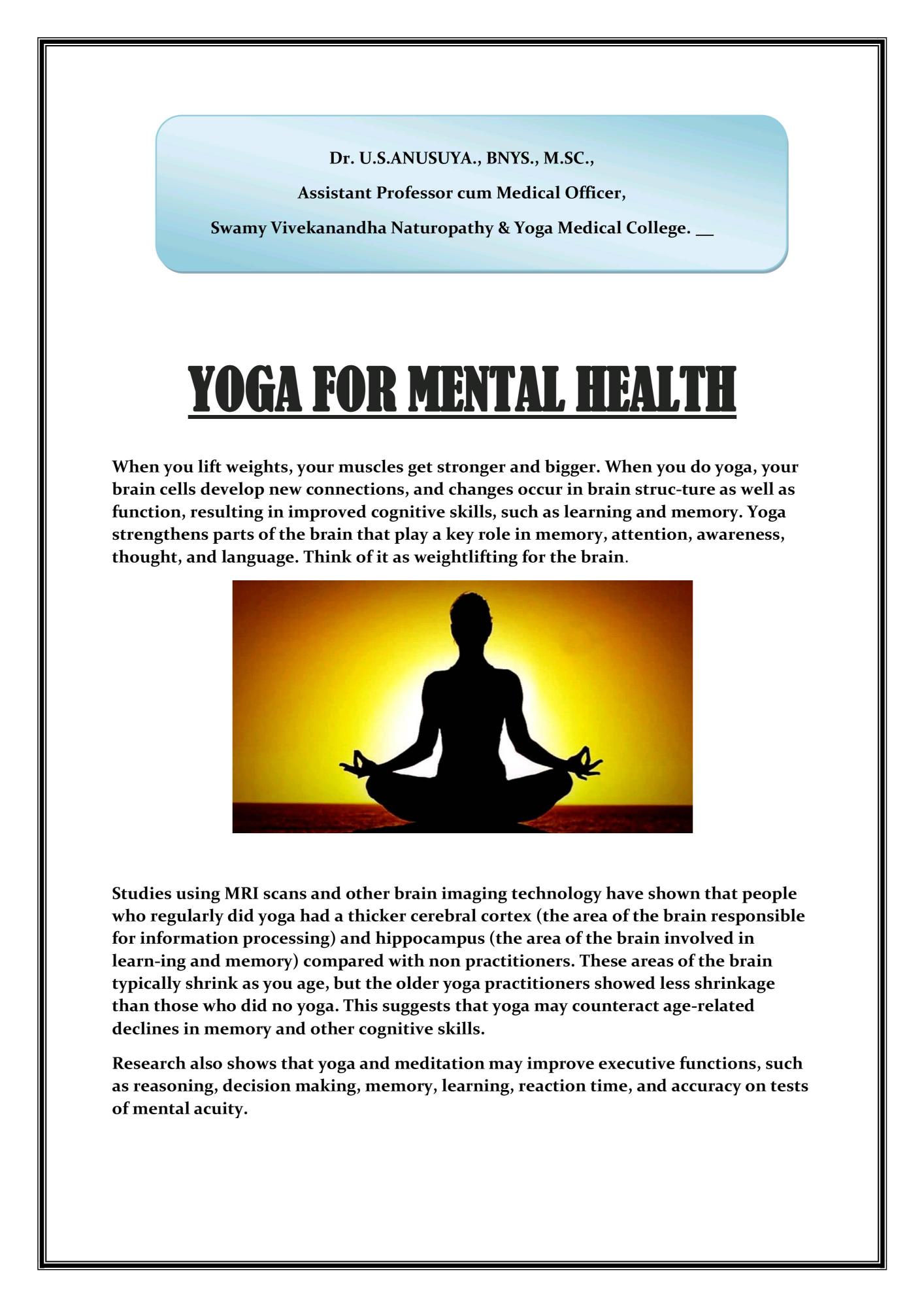 Article about Yoga for Mental Health by Dr. Anusuya U. S , Assistant professor cum Medical Officer at Swamy Vivekanandha naturopathy and yoga medical college sankari, salem(dt)