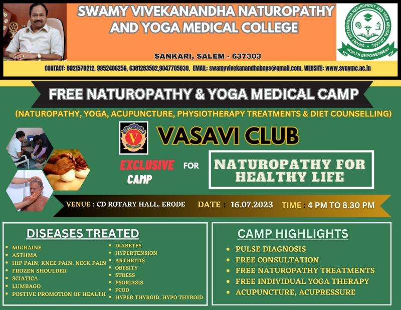Swamy Vivekanandha Naturopathy and Yoga Medical college & Hospital Sankari, salem conducted Naturopathy and Yoga Camp at CD Rotary Hall, Erode on 16.07.2023(4.00pm to 10.30pm).Around 70 beneficiaries were consulted and given awareness regarding Naturopathy and Yogic way of treatments