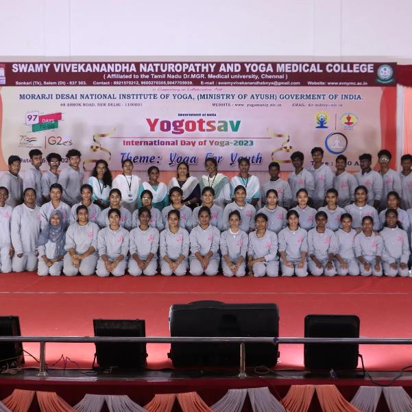 Mass 97 Days Count Down Yogtsav celebration with a gathering of around 3000 participants on 16.3.23 by Swamy Vivekanandha Naturopathy and Yoga Medical College Salem,Tamil Nadu, in collaboration with Morarji Desai National Institute of Yoga,New Delhi,Ministry of AYUSH, Government of India with the theme "Yoga for Youth".
