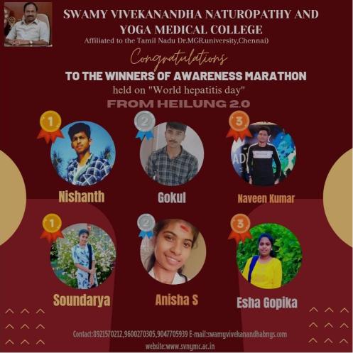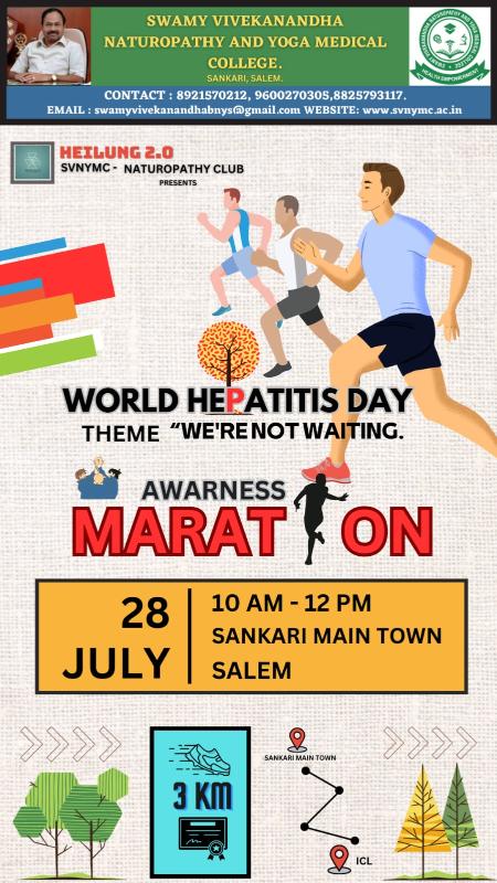 Swamy Vivekanandha Naturopathy and Yoga Medical college is going to conduct an Awareness Marathon with the theme of "We are not waiting" on July 28, World Hepatitis Day which is presented by Heilung 2.O Naturopathy club