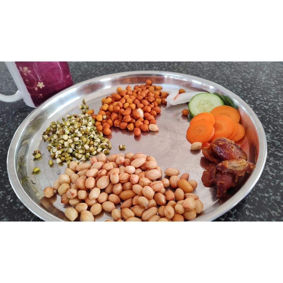 Tuesday's Naturopathy Breakfast of our SVNYMC students.. Soaked sprouts, Sprouted black chana, soaked peanuts, Dates ,Raw vegetables ( Cucumber, Carrot, Coconut) and Ragi malt - #Eat healthy. Be nutrition wealthy